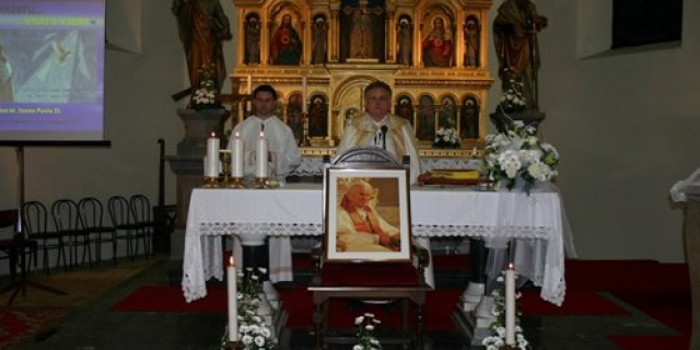Večernju sv. misu je predvodio župnik Vladimir Bogdan, te se rado prisjetio tog dana kad je prije 34 godine službu Petrova nasljednika započinjao svijetu do tada nepoznati kardinal Karol Wojtyla. M