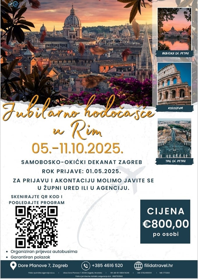 [HODOČAŠĆE U RIM POVODOM GODINE JUBILEJA] Najavljujemo hodočašće u Rim prigodom Redovitoga jubileja, odnosno Svete godine 2025. Hodočašće će se održati od 05. do 11. listopada