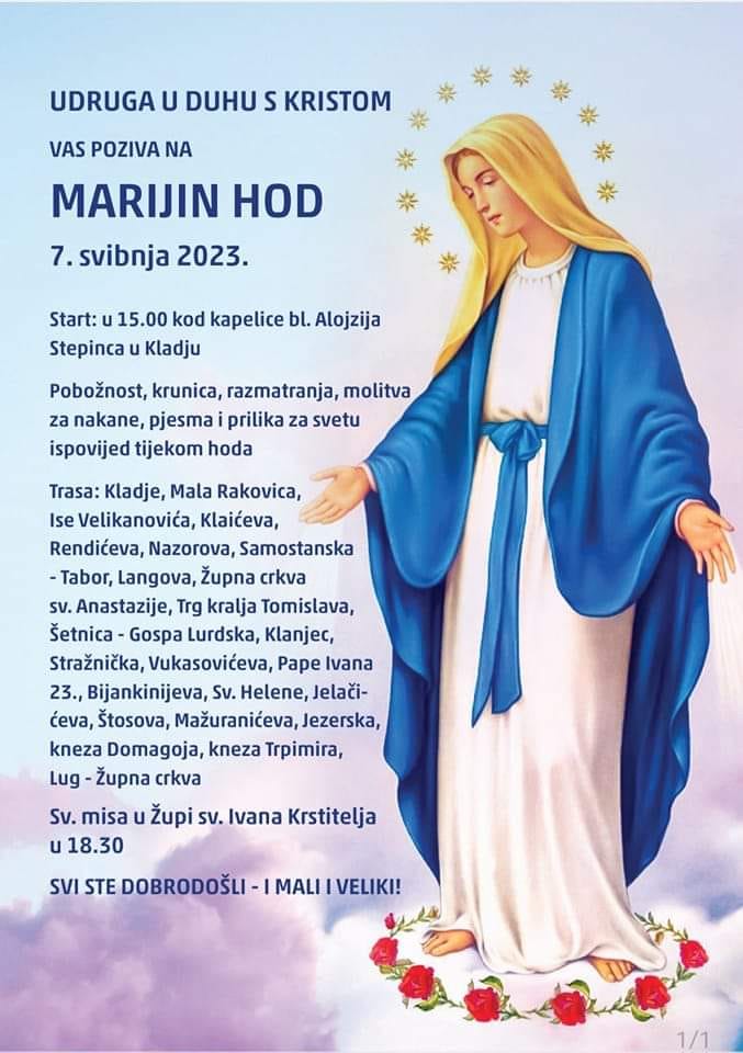 [MARIJIN HOD] Nadolazeće nedjelje 7.svibnja, u Samoborsko - okićkom dekanatu u organizaciji udruge U Duhu S Kristom, od 15 sati održat će se Marijin hod. Početak i okupljanje hodočasnika je u mjest