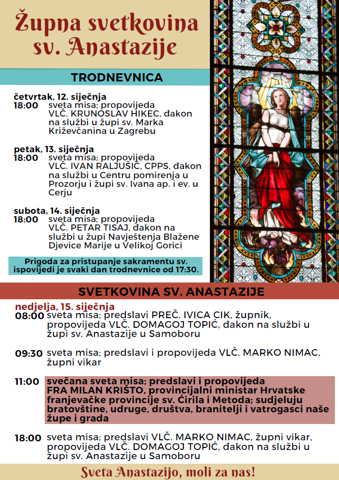 [TRODNEVNICA I BLAGDAN SV. ANASTAZIJE] U nedjelju 15. siječnja slavimo našu župnu svetkovinu svete Anastazije mučenice. Svete mise na sam dan slavit ćemo u 08:00, 09:30, svečana misa u