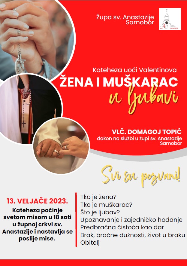 [KATEHEZA ZA VALENTINOVO] U ponedjeljak, 13. veljače, u našoj župnoj crkvi, đakon vlč. Domagoj Topić održat će katehezu "Žena i muškarac u ljubavi". Kateheza počin