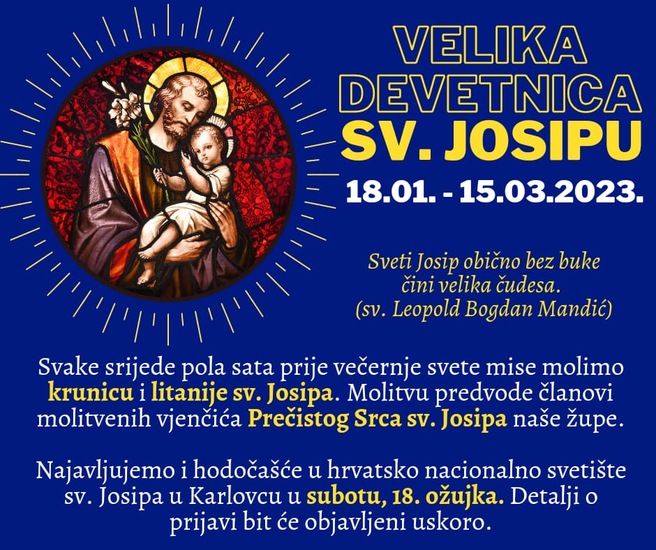 [VELIKA DEVETNICA SV. JOSIPU] Sutra, u srijedu 18.01., započinjemo veliku devetnicu sv. Josipu. Svih devet srijeda do svetkovine sv. Josipa molit ćemo krunicu i litanije sv. Josipa pola sata prije