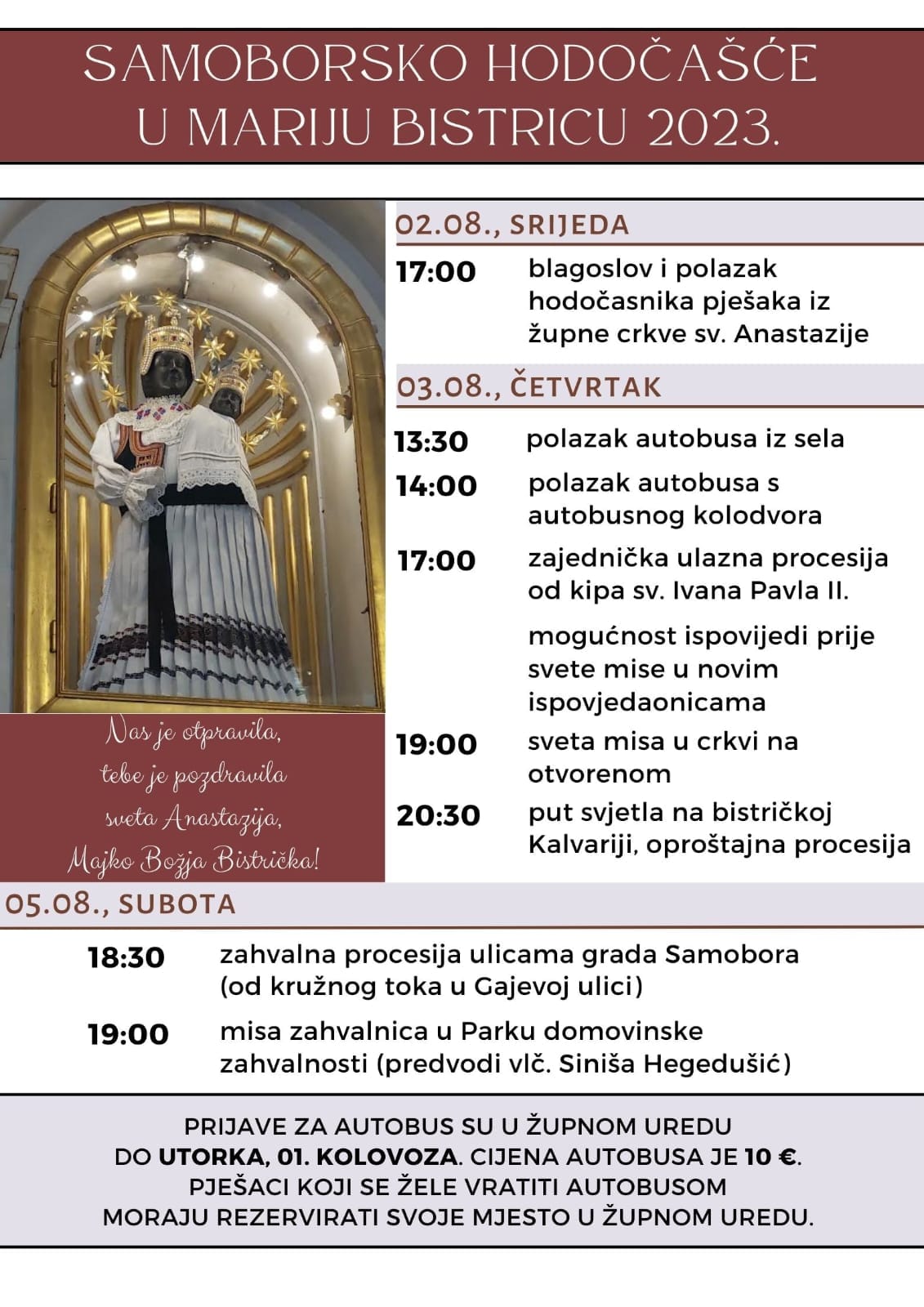 [SAMOBORSKO HODOČAŠĆE U MARIJU BISTRICU] Najavljujemo tradicionalno samoborsko hodočašće u Mariju Bistricu. Pješaci kreću u srijedu 02. kolovoza, ispred župne crkve sv. Anastaz