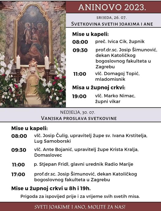 [ANINOVO 2023.] Bliži nam se župna svetkovina svetih Joakima i Ane, roditelja Blažene Djevice Marije, koju posebno proslavljamo u našoj kapeli sv. Ane. Svete mise u kapeli slavit ćemo u srij