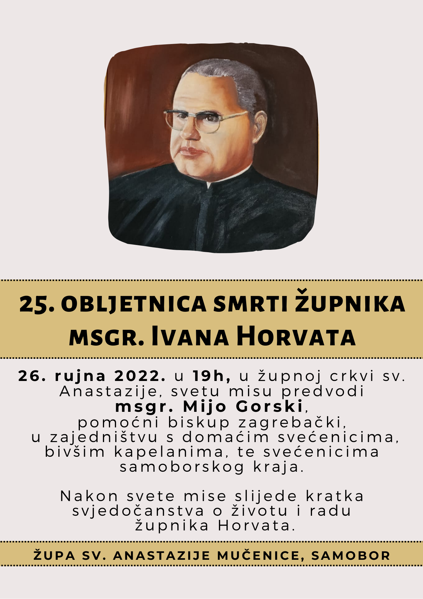 [OBLJETNICA SMRTI MSGR. IVANA HORVATA] U ponedjeljak, 26. rujna, navršava se 25. obljetnica smrti župnika msgr. Ivana Horvata. Toga dana Gospodinu ćemo prikazati svetu misnu žrtvu za njegovo