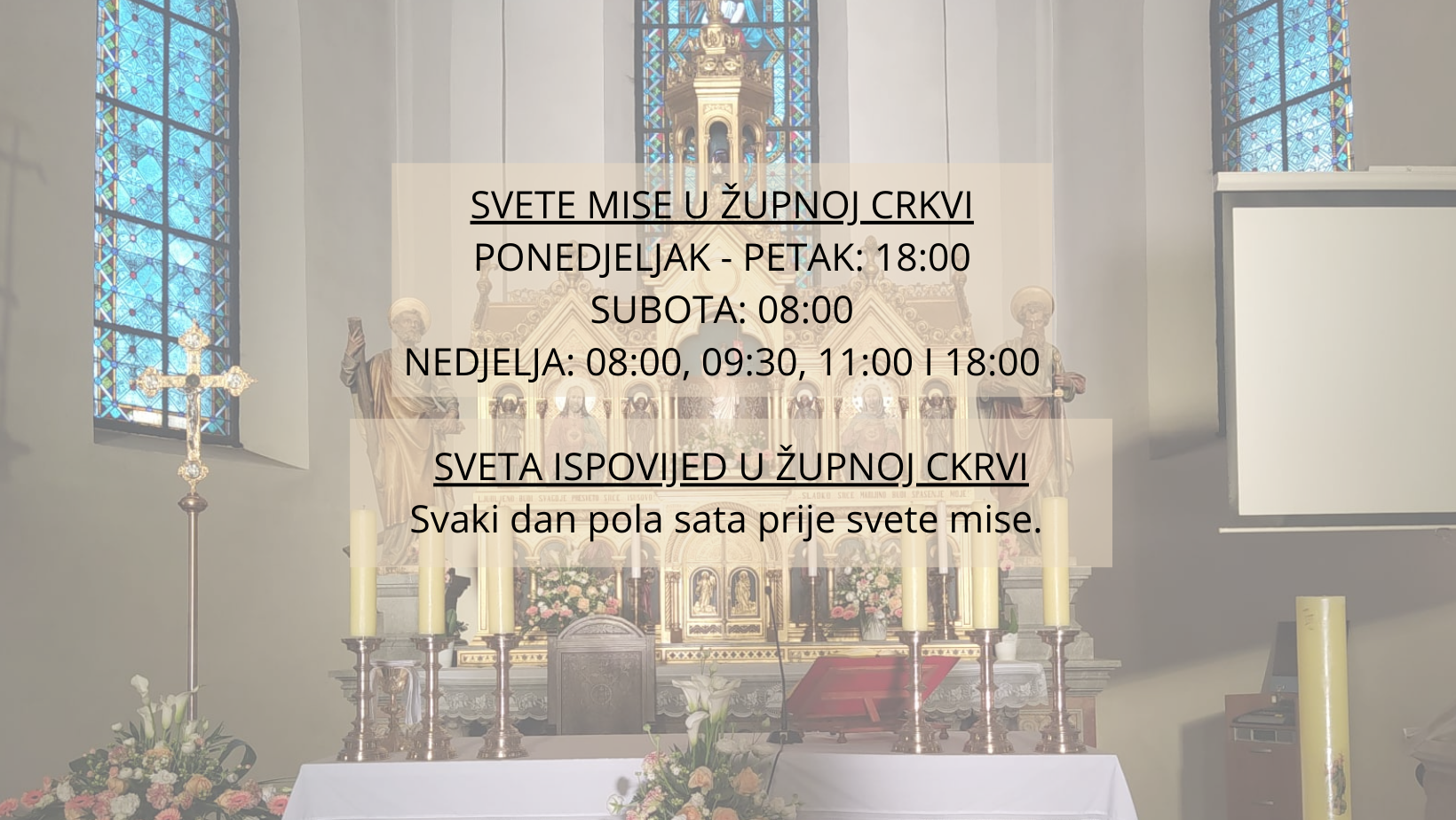 DVADESET I DEVETA NEDJELJA KROZ GODINU 16. listopada 2022. 1. SVETE MISE U ŽUPNOJ CRKVI NEDJELJOM: 8, 9.30, 11 i 19 SATI RADNIM DANOM: 19 SATI SUBOTOM: 8 SATI