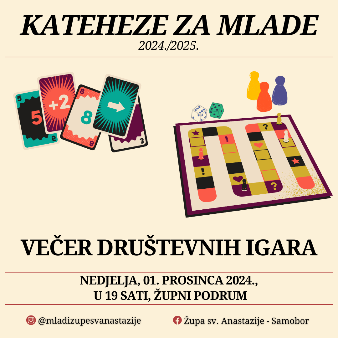 [KATEHEZA ZA MLADE - DRUŠTVENE IGRE] U nedjelju 01. prosinca 2024., nastavljamo dalje sa susretima za mlade. Ove nedjelje, nakon večernje svete mise, družit ćemo se uz društvene ig