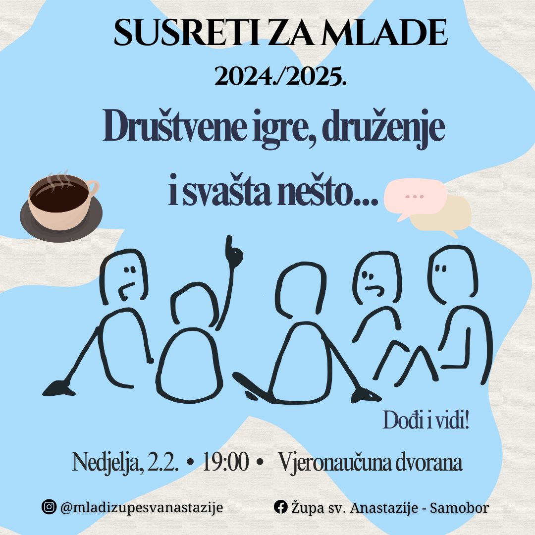 [SUSRETI ZA MLADE] U nedjelju, 02.02. nastavljamo s redovitim susretima zajednice mladih, čiji je redoviti termin nedjeljom nakon večernje svete mise u vjeronaučnoj dvoranu. Pozivamo sve srednjo