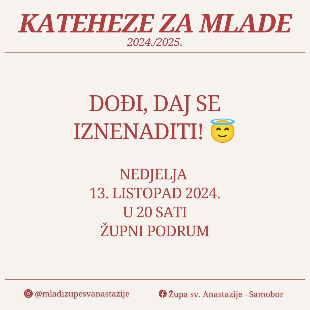 [KATEHEZE ZA MLADE] Danas nastavljamo s redovitim susretima zajednice mladih, čiji je redoviti termin nedjeljom nakon večernje svete mise u župnom podrumu. Tema kateheze: Dođi i vidi! Pozivam