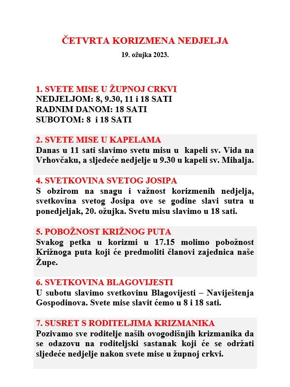 ČETVRTA KORIZMENA NEDJELJA, 19. ožujka 2023.