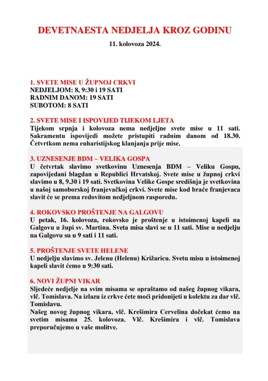 DEVETNAESTA NEDJELJA KROZ GODINU, 11. kolovoza 2024.
