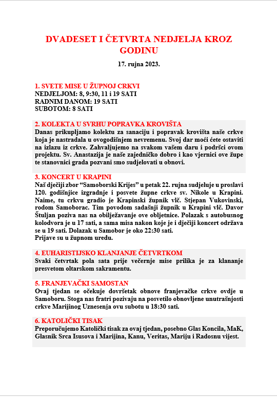 DVADESET I ČETVRTA NEDJELJA KROZ GODINU, 17. rujna 2023.