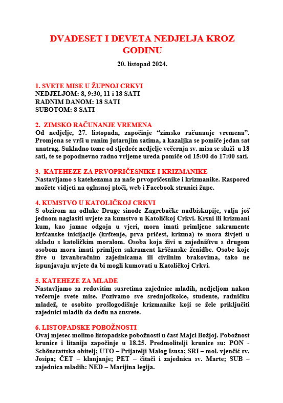 DVADESET I DEVETA NEDJELJA KROZ GODINU, 20. listopad 2024.