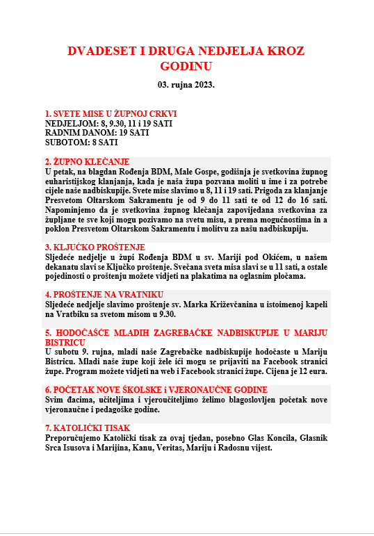 DVADESET I DRUGA NEDJELJA KROZ GODINU, 03.rujna 2023.