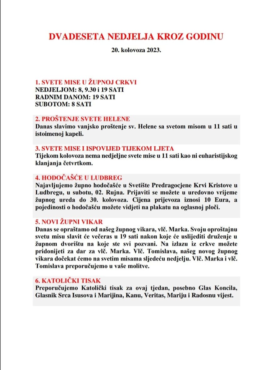DVADESETA NEDJELJA KROZ GODINU, 20. kolovoza 2023.