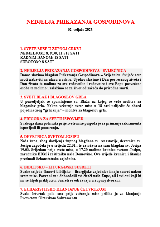 NEDJELJA PRIKAZANJA GOSPODINOVA - SVIJEĆNICA, 02. veljače 2025.