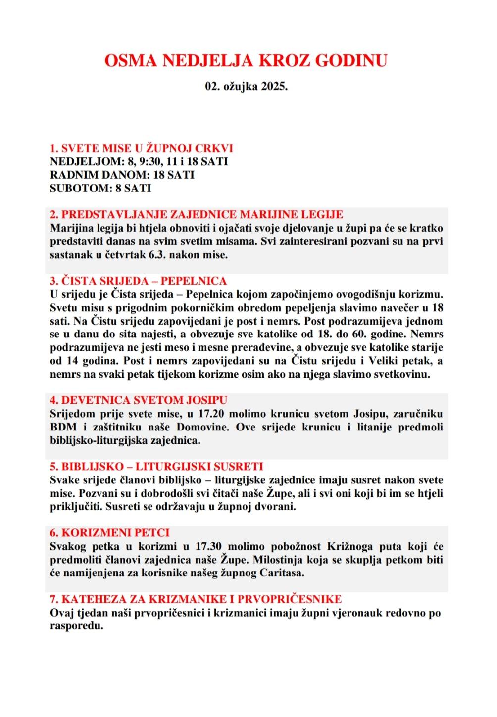 OSMA NEDJELJA KROZ GODINU, 02. ožujak 2025.