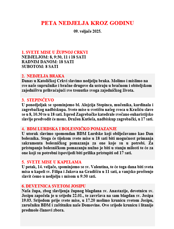 PETA NEDJELJA KROZ GODINU, 09. veljače 2025