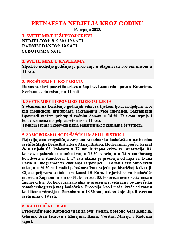 PETNAESTA NEDJELJA KROZ GODINU, 16. srpnja 2023.