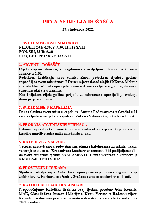 PRVA ADVENTSKA NEDJELJA, 27. studeni 2022.