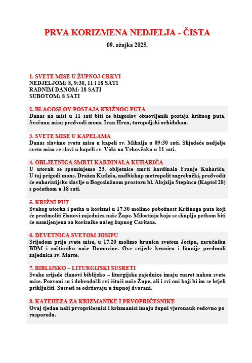 PRVA KORIZMENA NEDJELJA - ČISTA, 09. ožujka 2025.