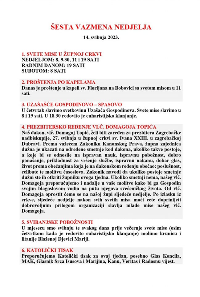 ŠESTA VAZMENA NEDJELJA, 14. svibnja 2023.